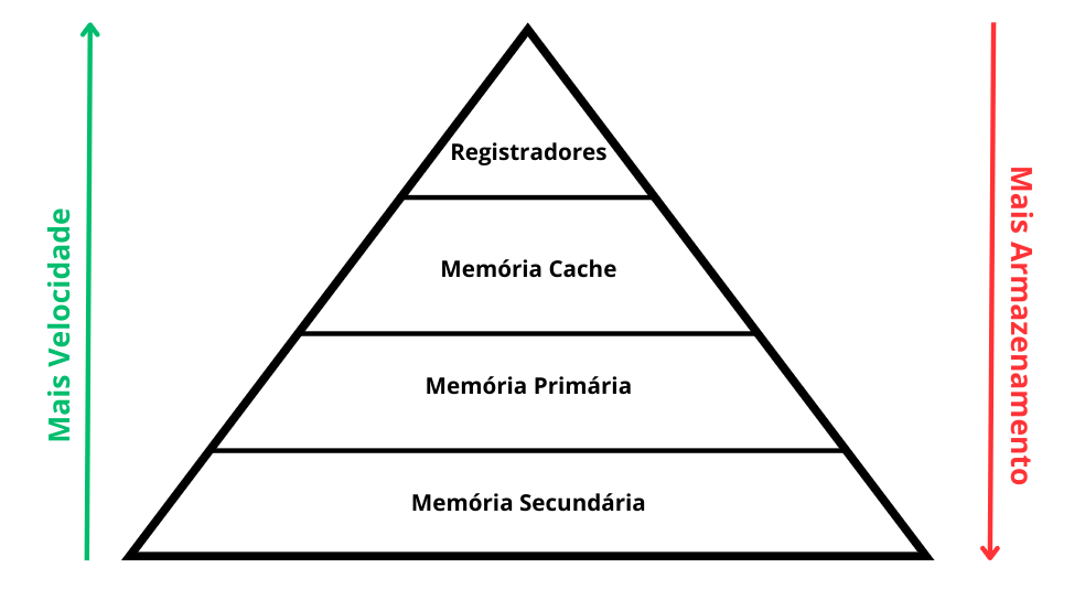 A Figura 1 apresenta o funcionamento da hierarquia entre os tipos de memórias disponíveis em sistemas digitais. Repare que as memórias no topo da pirâmide (registradores) são as de acesso mais rápido pelo processador, porem possuem menos capacidade de armazenamento de dados (poucos bytes). À medida que desce-se a pirâmide, as memórias passam a ter mais capacidade de armazenamento, porém o acesso dos dados pelo processador fica mais lento. Mais explicações sobre este assunto pode ser obtido no Blog Formação Dev (clique aqui).