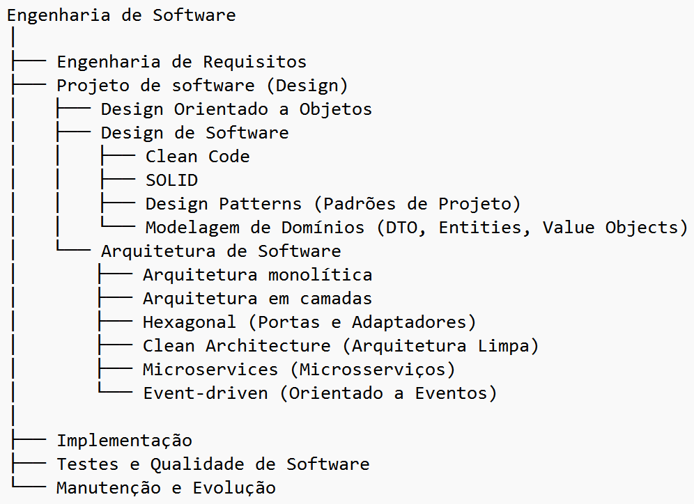 Neste artigo apresentaremos uma estrutura teórica para uma disciplina moderna de Engenharia de Software, ajustando levemente sua taxonomia para refletir como a indústria e a academia (através do Software Engineering Body of Knowledge – SWEBOK) organizam esses domínios. O mapa mental hierárquico que estamos descrevendo está representado na Figura 1.