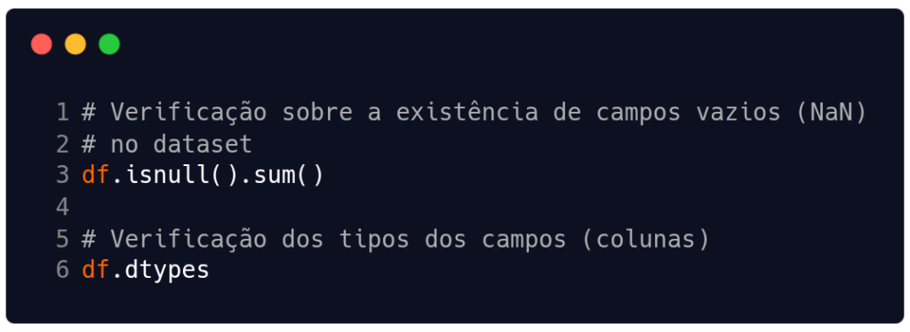 Seguindo o código, optamos por verificar se havia ou não algum campo nulo (NaN) no dataset. Obviamente não há, pois este arquivo foi pré-processado previamente por nós e os campos nulos foram preenchidos. (Obs: recomendamos a leitura indicada antes de começarmos este exemplo). Na linha 6 da Figura 2, estamos verificando quais são os tipos dos campos.