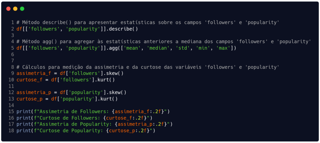 Falta obtermos algumas métricas de forma para as variáveis. Por isso, a partir da linha 9 na Figura 3 calculamos e imprimimos a assimetria e a curtose de 'followers' e 'popularity'. Agora, temos as medidas de tendência central, de dispersão e de forma dos dados.