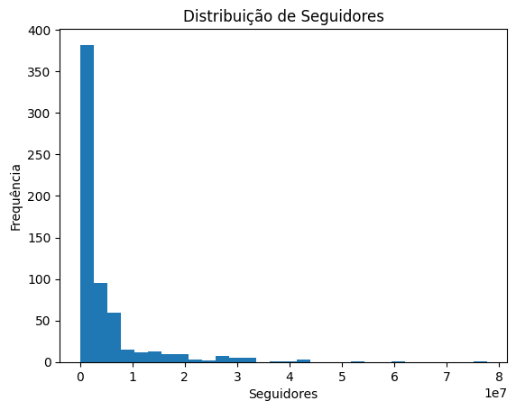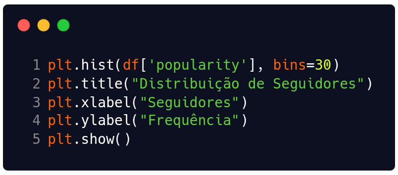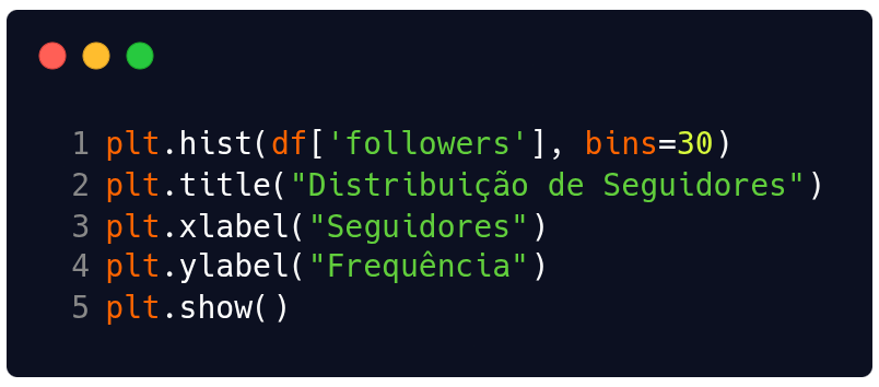 Com os números em mãos, partiremos para observar gráficos, mais especificamente o histograma. Este gráfico é interessante pois permite que analisemos visualmente a distribuição dos dados na variável. Na Figura 4 estamos construindo e plotando o histograma dos dados presentes no campo 'followers'. O resultado dessa plotagem está na Figura 5.