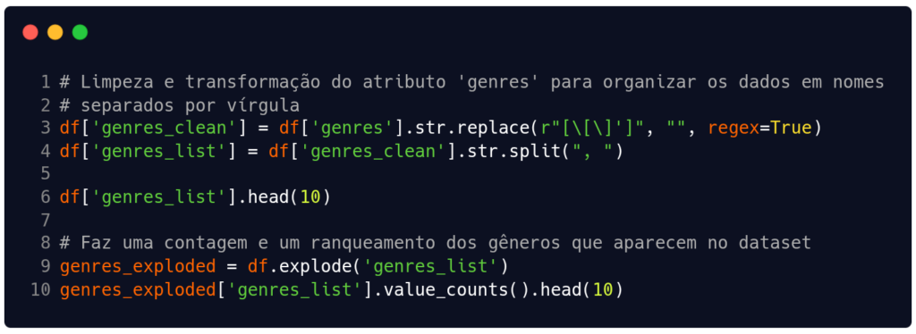 Na Figura 8 estamos limpando e transformando os valores que estão dentro do campo 'genres' para que possamos apresentar uma contagem absoluta de quantas vezes os nomes dos gêneros aparecem no banco de dados. Veja, o atributo 'genres' não é numérico, por isso não fizemos cálculos para média, desvio padrão etc. Assim, optamos por fazer essa transformação que nos permitirá obter uma frequência absoluta (contagem) dos valores (uma estatística descritiva mais simples).