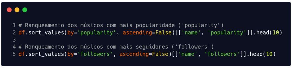 Chegando na reta final de nosso código, optamos por ranquear os 10 músicos com mais seguidores e mais popularidade, apenas para fins de observação pessoal mesmo. Considere essa parte como mais um bônus de exploração na base de dados. Nas linhas 2 e 5 da Figura 9 ordenamos os valores e pedimos para o método sort_values apresentar os resultados com base nas colunas 'popularity' e 'followers'. Os resultados dessas linhas podem ser vistos nas Tabelas 2 e 3.