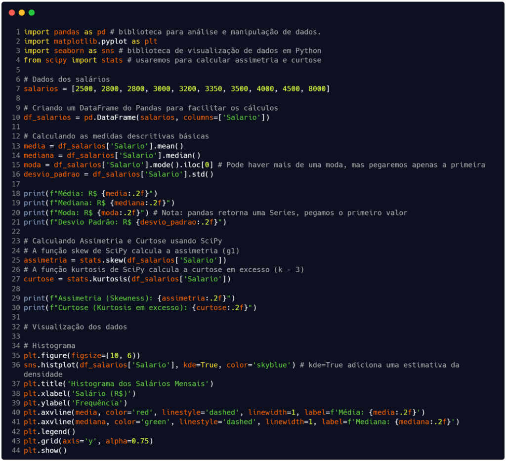 Para finalizar os testes, eles executaram o Código 1 para averiguar os valores calculados para medidas de tendência central e dispersão, além da assimetria e curtose. Ao final ainda imprimiram um gráfico dos salários (histograma) para terem melhor visão sobre a distribuição dos dados e dos resultados.