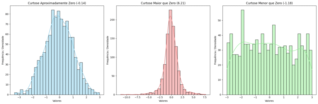 Repare que em todas as opções existem a comparação com o valor 0 e 3. Isso acontece porque a distribuição normal padrão tem uma curtose de 3 quando usamos a fórmula não ajustada. Porém, para facilitar a interpretação, usa-se a curtose em excesso, que subtrai esse valor de referência. Logo, a comparação passa a ser com o valor 0 (zero). Muitos softwares calculam a curtose em excesso (kexcess), que é simplesmente o valor da curtose (k) menos 3 [k − 3]. Como dito anteriormente, isso é feito para que uma distribuição normal tenha curtose igual a 0, facilitando a interpretação. Na Figura 2 apresentamos exemplos de distribuições com as possíveis curtoses.