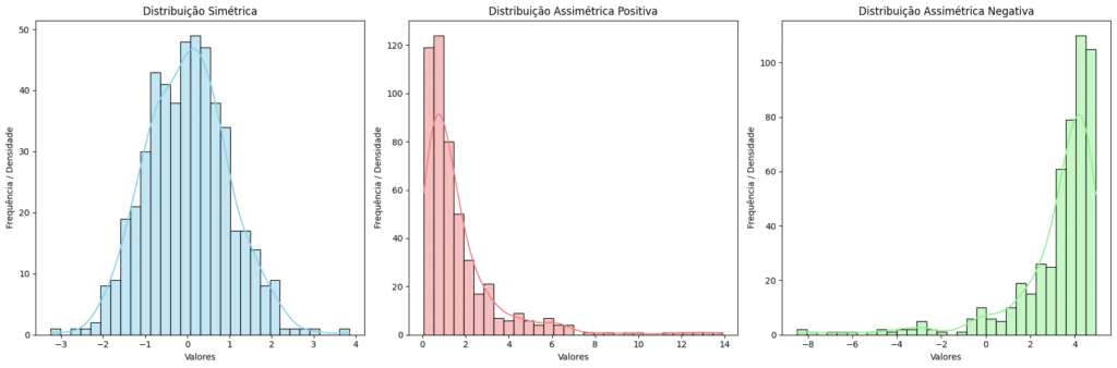 A assimetria (ou skewness) é uma medida que indica o grau de desvio da distribuição dos dados em relação a uma distribuição simétrica (como a curva normal, onde a média, mediana e moda coincidem). Podemos encontrar três situações possíveis: