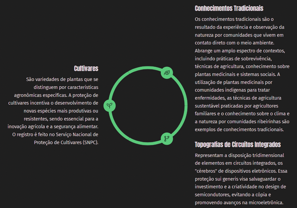 | Foca na proteção de obras literárias, artísticas e científicas, como livros, músicas, filmes, esculturas e pinturas. Além disso, é possível registrar programas de computador. | Trata das criações com aplicação industrial, como invenções (patentes), marcas que identificam produtos ou serviços, desenhos industriais (design de produtos) e indicações geográficas que atestam a origem e qualidade de produtos. | Refere-se a formas de proteção específicas que não se encaixam perfeitamente nas categorias anteriores, como a proteção de cultivares (variedades de plantas) e saberes tradicionais, que possuem regimes legais próprios devido às suas particularidades. |